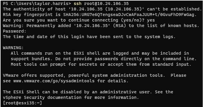After the upload is complete, it is time to kick off the upgrade. Start by SSHing to your ESXI host. You may have to enable SSH as it is disabled by default. This can be done by navigating to Host -> Actions -> Services -> Enable Secure Shell (SSH). Your SSH session should look something like this: