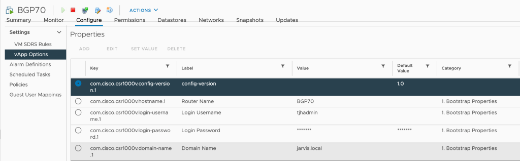 These values are referenced during the deployment/configuration of the Virtual Appliances. You may be wondering how we are able to configure the appliance during deployment. With every OVA, there are a series of “VAPP Properties” that are defined and then passed through to the VM during the boot process. You can view these values by going to the following configuration path within vCenter.