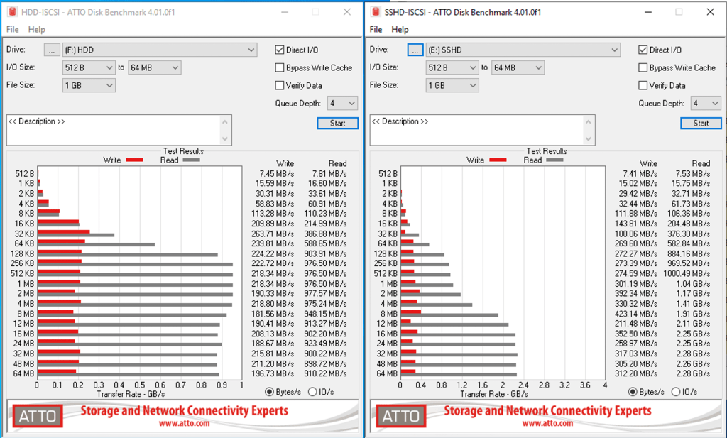 With this setup, while connected to VMware via ISCSI, I am able to get results (through Atto) that are exceeding 2GB/s with certain workloads/file sizes. This is of course on the volume that is fronted by the NVMe Cache but 900MB/s is still very impressive on Hard Drives. All of my testing has been with Dual 10G connections per device operating with MultiPathing enabled.