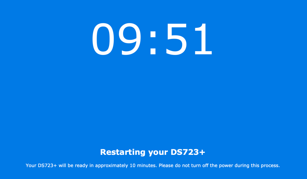 The installation and upgrade takes about 3 minutes but be prepared to wait the full 10 minutes. The NAS will restart on its own once all the upgrades are complete.