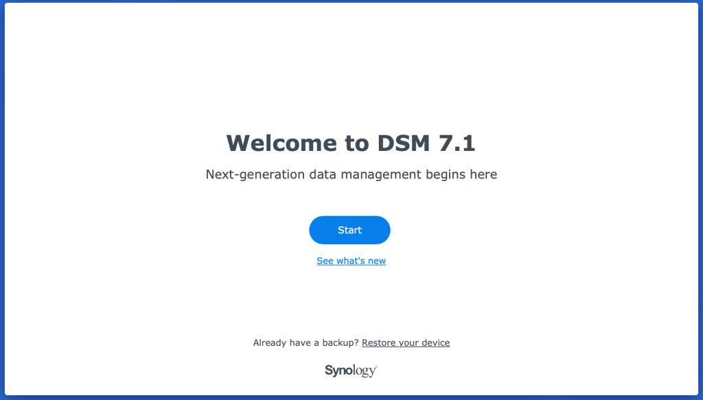 After 5-10 minutes, the configuration of the Synology can begin! Its important to note that if you have a configuration backup from a previous device, you can initiate the restore from here!