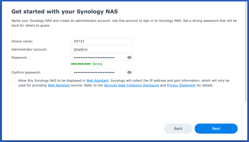 During the next few screens, you will be asked for information like hostname, username, password, update policy and Synology Account. These can be configured as required and in line with any personal preference. Synology does recommend to use something other than “admin” as the username as it can prevent/help with brute force attempts.