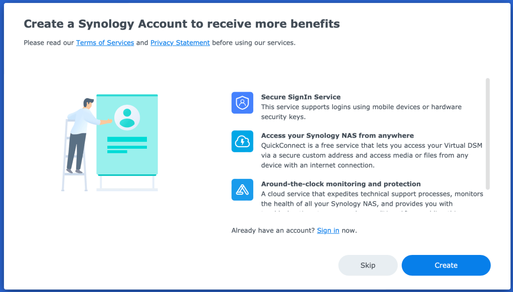 The use of a Synology Account is highly recommended as it enabled some addition features like QuickConnect and Monitoring. QuickConnect allows you to access your NAS from anywhere without the need of a VPN.