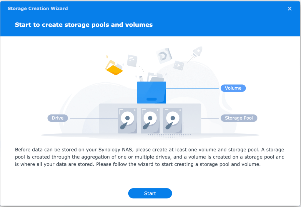There are two main storage concepts that are leveraged when provisioning a Synology DiskStation (or RackStation). These are Storage Pools and Volumes. The Storage Pool is a collection of disks that are configured in a “Protection Group”. Think of this as the “RAID” volume but with additional capabilities. The Volume is the partition that has the File System.
