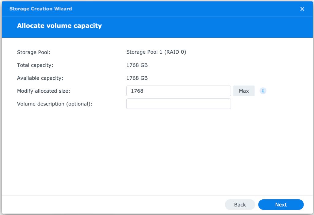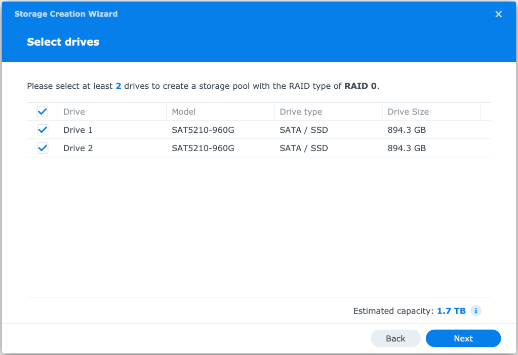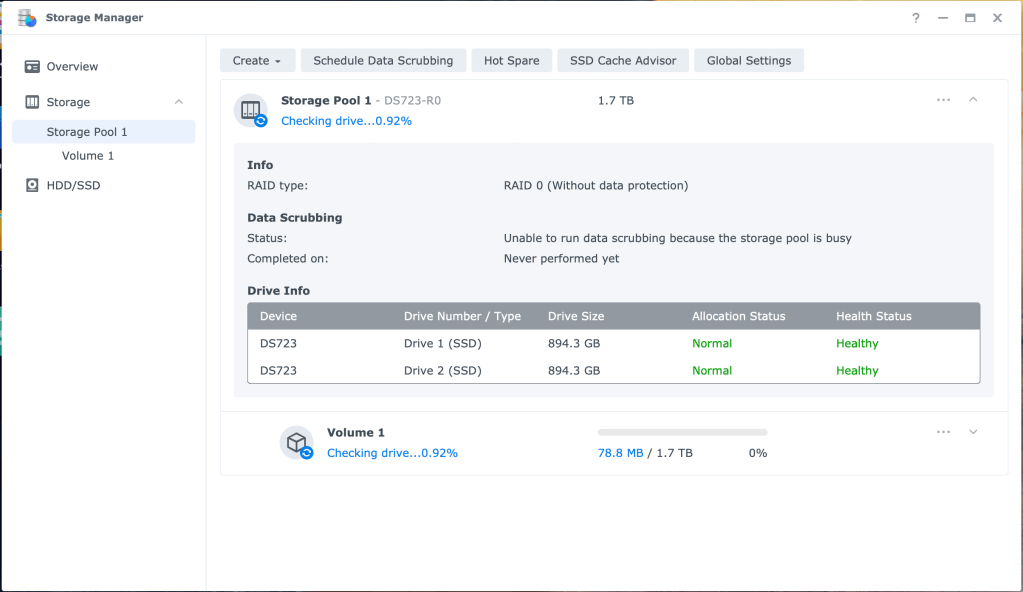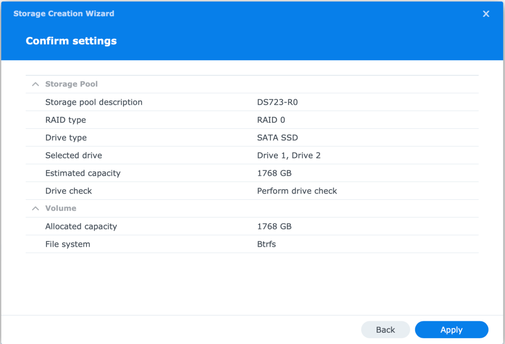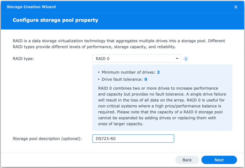 For my Lab environment, I will be using RAID-0 as the Data is not important and will be backed up using Synology’s could service (future blog post). This is NOT recommended for production.