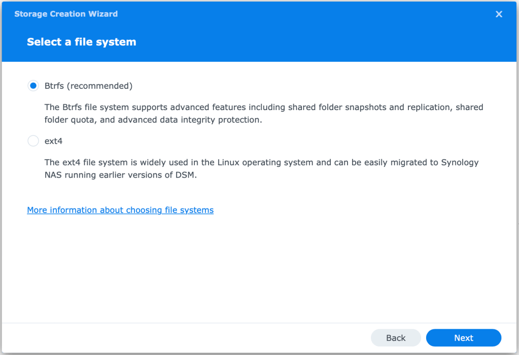 After the Drive check, its time to create the Volume. As stated earlier, the Volume is where the File System (BTRFS) is created. Storage Pools can have multiple volumes but for this environment, we will use the maximum amount of space and then select the recommended file system on the next screen.