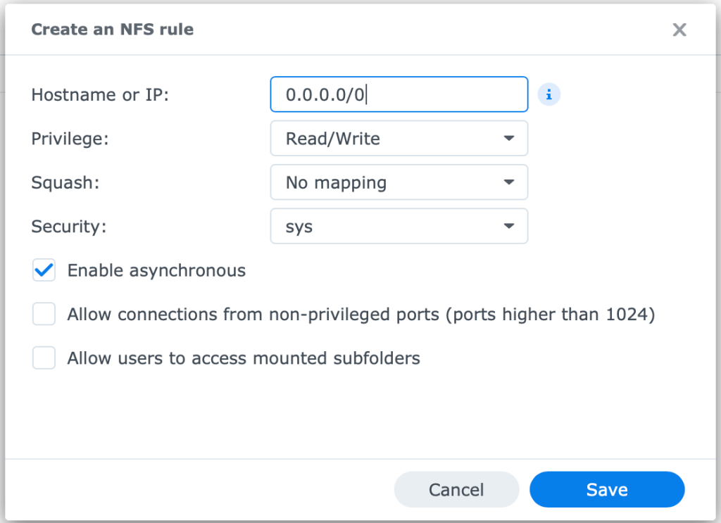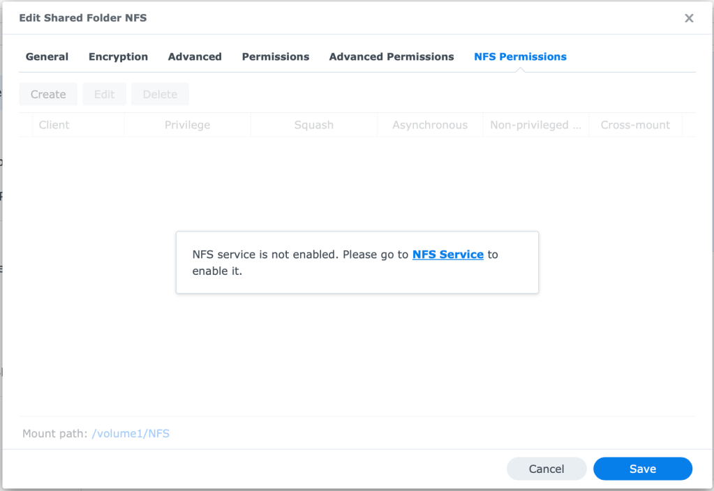 You may have asked/thought “Why are we skipping permissions if we are going to use this for NFS?” That is because NFS permission are handled differently from SMB/File Permissions. Within the Edit menu on the Shared Folder, there is a special tab for NFS.