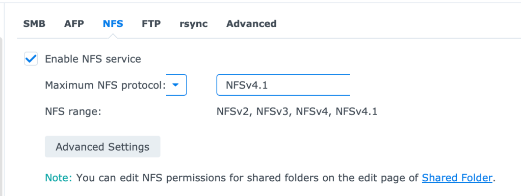 As you can see, by default NFS is disabled but Synology provides a link to the Settings page that will enable the service.